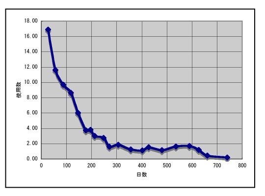 経過を横軸を日数、縦軸を1日の消費枚数で示すとこんな風になる。退院後外来で通院したが、先生からは「PSAは0.01以下」と聞き「パッド消費は?」と聞かれ「この位です」と答えるだけで、ものの数分の外来で2年を経過した。